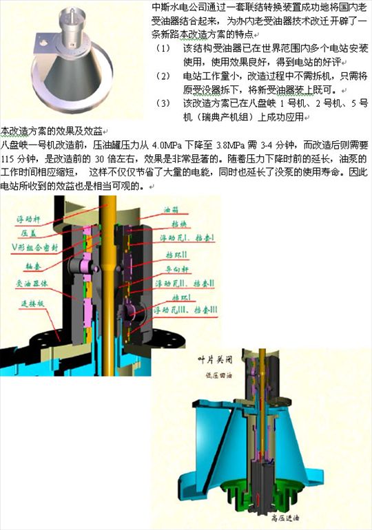 主要产品有:受油器、弹簧联杆、油压装置、油压装置专用组合阀、滤水器、PLC型中小型水轮机调速器、自动化元件,过速限制器、示流器、组合式进水阀控制 柜、PLC油压装置控制柜(箱),水轮发电机用制动器,操作油管、导叶轴套(含油型Mc尼龙)弹性F4推力瓦、各种合金瓦、空气橡胶围带等。主要配套:螺 杆油泵、潜水排污泵等系列产品。特别是本公司最新开发制造的油压装置系列专用组合阀,国内独创处于领先水平。水轮发电机用制动器采用偏心联结,上下活塞间 蝶簧传递力,活塞结构行业内独家采用。滤水器转筒有防机械卡死功能,并且造型美观合理。以上产品在行业享有一定的声誉。